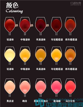 籠統(tǒng)地說,葡萄酒按顏色可以分為紅葡萄酒、桃紅葡萄酒和白葡萄酒。不過實(shí)際上,不同的紅葡萄酒往往在色澤上有些微差異;即使是同一款酒,年輕的時(shí)候和陳年之后的顏色也不一樣;桃紅、白葡萄酒也都這樣。