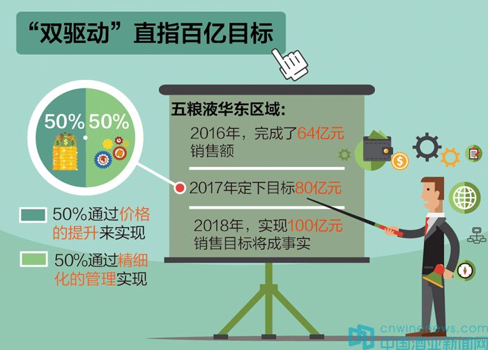2015年,五糧液公司華東營銷中心提出“5個(gè)100”市場建設(shè)規(guī)劃,即100億銷售目標(biāo)、100強(qiáng)區(qū)域、100強(qiáng)商家、100強(qiáng)網(wǎng)點(diǎn)、100強(qiáng)銷售人員。其中,打造“百億華東”成為了華東營銷中心的奮斗目標(biāo)。