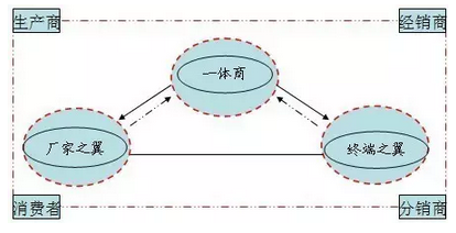 一體一翼商,是一體兩翼商的兩個自由變形組合,兩者都是以區域一體商為基礎單元,不同的是在選擇產業鏈條突破時,分別走向了生產企業和終端連鎖發展不同的兩端,即區域經銷商的上游環節和下游環節。
