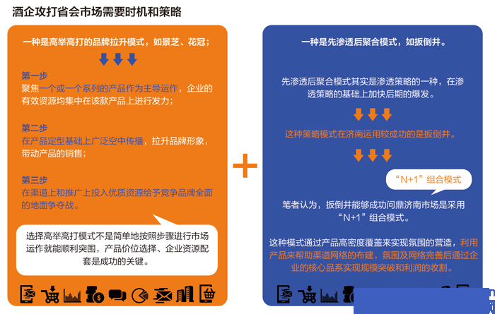 筆者認為,扳倒井能夠成功問鼎濟南市場的寶座并不是行業所總結的“1+N”模式,而是“N+1”組合模式。這種模式通過產品高密度覆蓋來實現氛圍的營造,利用產品來幫助渠道網絡的布建,氛圍及網絡完善后通過企業的核心品系實現規模突破和利潤的收割,扳倒井的高明之處在于后期企業在濟南市場額外追加了資源快速實現量到質的改變,這種先滲透后聚合的模式是一種穩妥的市場操作方式,適合企業規模有限的企業。