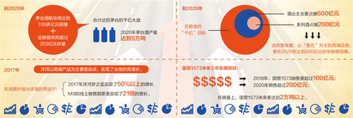 5月15日,瀘州老窖國窖酒類銷售股份有限公司第一次股東大會上,瀘州老窖首次對國窖系三大產品定位,提出國窖1573在2020年要向200億元跨越。根據瀘州老窖制定的國窖1573未來三年發展規劃:2018年,國窖1573銷售要超過100億元;2020年銷售超過200億元;銷量上,國窖1573未來要達到2萬噸以上。