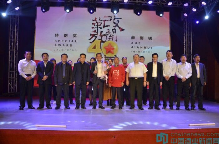 在改革開放40年,山東糖酒會迎來第80屆的時間節點上,為表彰 “二哥”——山東省糖酒副食品商業協會會長薛劍銳多年來持續為企業服務的貢獻,《華夏酒報》特別授予薛劍銳“改革開放40年——特別獎”。濱州市服務業發展局局長趙立杰、《華夏酒報》、中國酒業新聞網總編輯韓文友、泰山酒業集團董事長張銘新、山東景芝酒業股份有限公司總經理來安貴、山東國井集團副總裁張輝、古貝春集團董事長周曉峰、山東新星集團董事局主席魏心東、山東景陽岡酒廠有限公司董事長趙傳新、花冠集團釀酒有限公司董事長劉念波、濟南趵突泉釀酒有限責任公司董事長邢憲卿、山東天地緣酒業有限公司董事長張宏偉、山東青州云門酒業(集團)公司總經理王邦坤及《華夏酒報》團隊,共同為薛劍銳頒獎。