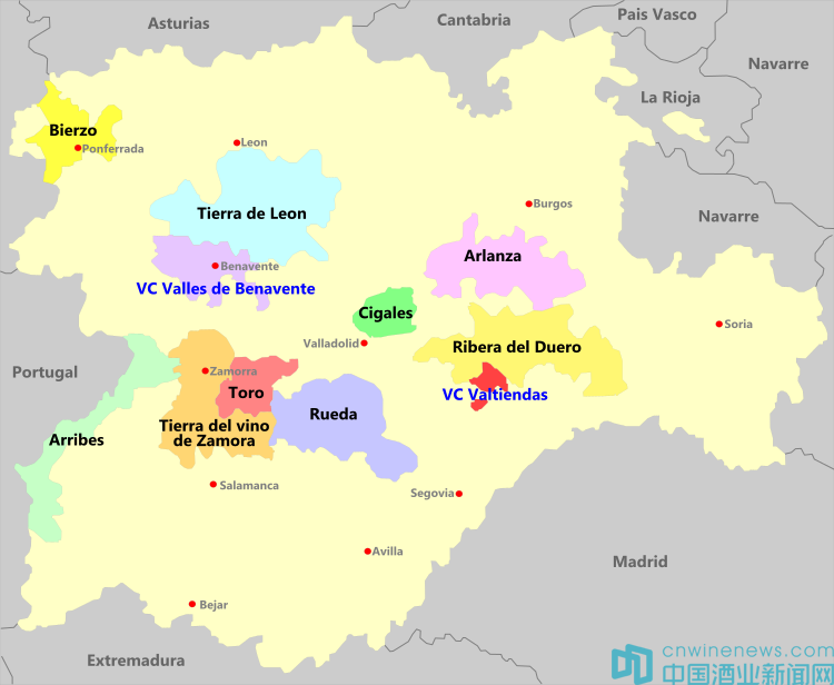 托羅是法定葡萄酒原產地中最靠西的一個。該葡萄酒產地以托羅市為中心,大部分葡萄園位于薩莫拉省(Provincia de Zamora)境內,還有一些葡萄園位于瓦亞多利德省境內。瓜雷尼亞河(Rio Guarena)在托羅市匯入杜埃羅河河流北岸是糧食種植區,被稱作 “面包之鄉” (Tierra deI Pan),河流以南和以西的地區是葡萄種植區,被稱作“葡萄酒之鄉”(Tierro deJ Vino)。托羅產區的葡萄酒采用添普蘭尼洛葡萄家族中一個名為“Tinta de Toro(托羅紅葡萄) ”的獨有品種,于1987年獲得了法定葡萄酒原產地稱號。托羅地區的氣候完全屬于大陸性氣候。托羅出產紅葡萄酒,白葡萄酒和玫瑰紅葡萄酒。托羅紅葡萄酒被分為以下幾類: