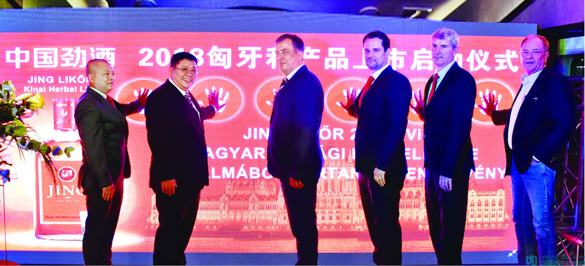 勁牌有限公司副總裁王楠波、長城匈中友協主席歐拉·勞約什、匈牙利國家貿易署中國區負責人博久立、長城匈中友協經濟部主任麥克、中國勁酒匈牙利經銷商佩德公司總裁劉國勇、匈牙利最大酒水批發商皮特,共同為中國勁酒2018匈牙利產品上市舉行了隆重的啟動儀式。