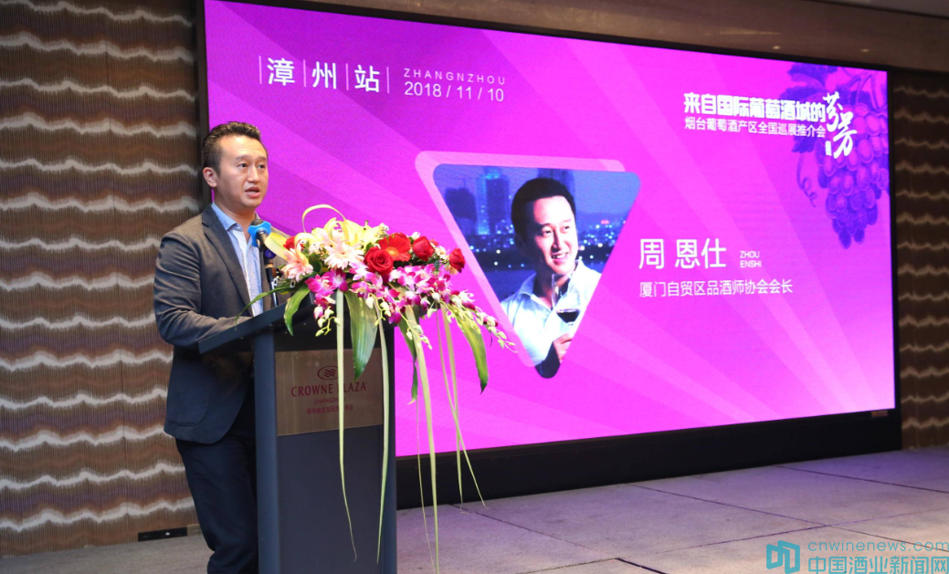 11月10日下午,由煙臺市葡萄與葡萄酒局、煙臺市葡萄與葡萄酒協會主辦,華夏酒報、中國酒業新聞網承辦,蓬萊市葡萄與葡萄酒局、愛酒人俱樂部、鑫峰鴻酒業機構協辦,廈門自貿區品酒師協會支持的“來自國際葡萄酒城的芬芳——2018煙臺葡萄酒全國巡展推介會(第五季)”在“田園都市”、“生態之城”漳州正式舉辦。