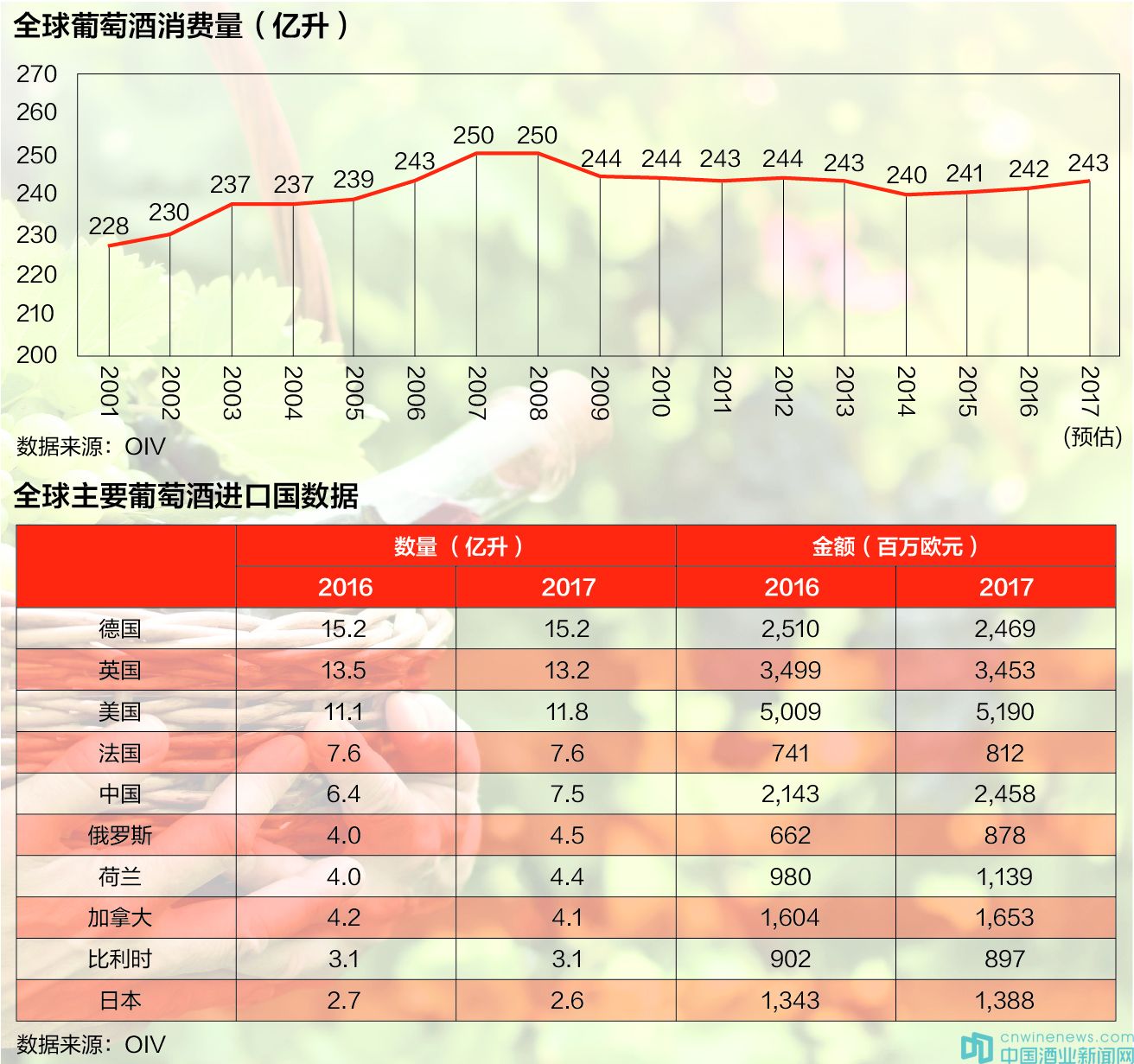 國際葡萄與葡萄酒組織(OIV)公布了2017年全球葡萄酒業的相關數據,包括全球葡萄種植面積、葡萄酒產量、葡萄酒消費以及葡萄酒進出口貿易情況。