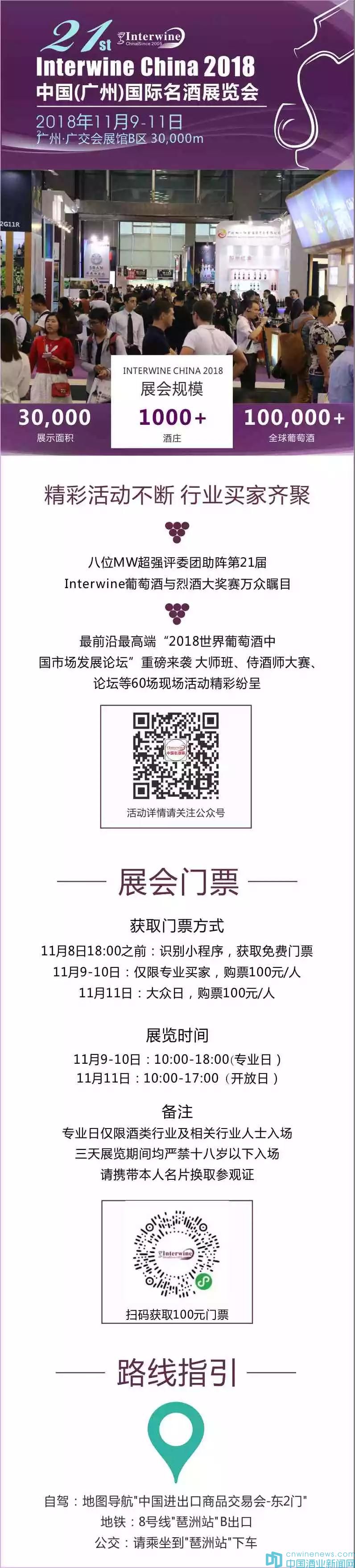 第21屆Interwine展會將于2018年11月9日-11日(周五—周日)在廣州廣交會展館B區(qū)9.3&10.3&11.3號館盛大舉行。更多信息,請訪問展會官網(wǎng):www.interwine.org。或在微信平臺上搜索“科通名酒展”,獲取更多展會新聞和最新資訊。