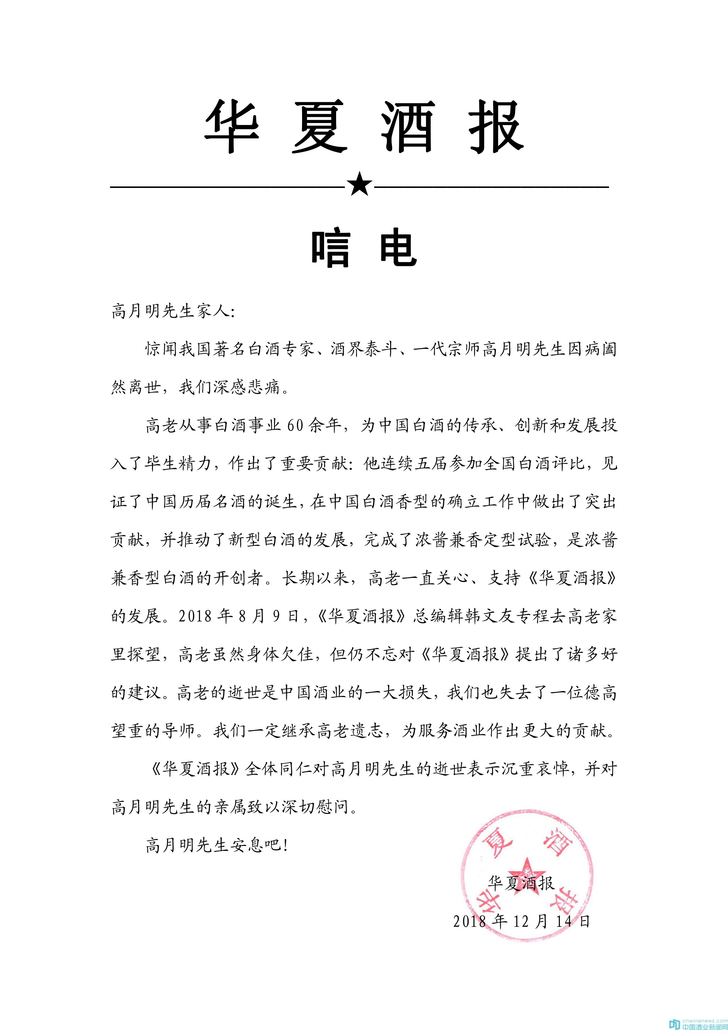 《華夏酒報》向高月明親屬發去了唁電,對高月明先生的逝世表示沉痛哀悼:“驚聞我國著名白酒專家、酒界泰斗、一代宗師高月明先生因病闔然離世,我們深感悲痛。高老從事白酒事業60余年,為中國白酒的傳承、創新和發展投入了畢生精力,作出了重要貢獻:他連續五屆參加全國白酒評比,見證了中國歷屆名酒的誕生,在中國白酒香型的確立工作中做出了突出貢獻,并推動了新型白酒的發展,完成了濃醬兼香定型試驗,是濃醬兼香型白酒的開創者。長期以來,高老一直關心、支持《華夏酒報》的發展。2018年8月9日, 《華夏酒報》總編輯韓文友專程去高老家里探望,高老雖然身體欠佳,但仍不忘對《華夏酒報》提出了諸多好的建議。高老的逝世是中國酒業的一大損失,我們也失去了一位德高望重的導師。我們一定繼承高老遺志,為服務酒業作出更大的貢獻。《華夏酒報》全體同仁對高月明先生的逝世表示沉重哀悼,并對高月明先生的親屬致以深切慰問。高月明先生安息吧! ”