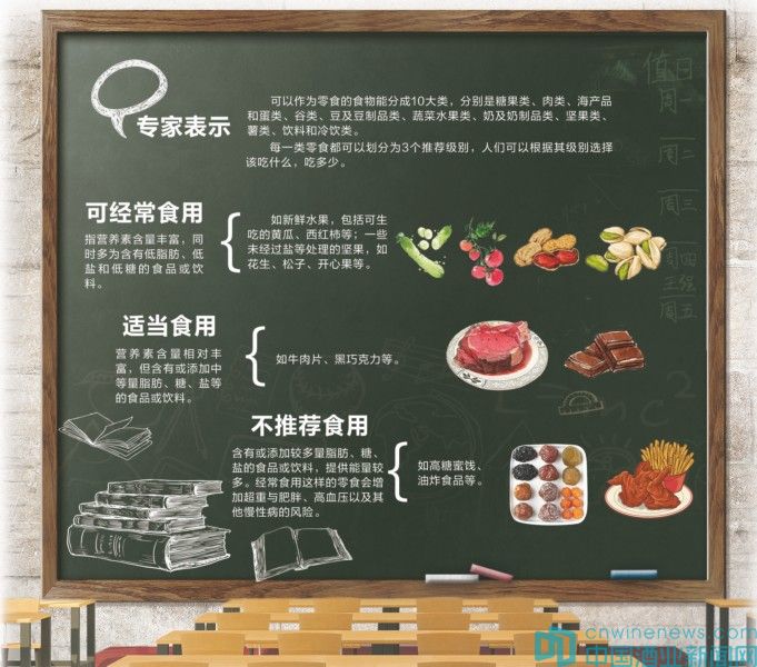 專家表示,可以作為零食的食物能分成10大類,分別是糖果類、肉類、海產(chǎn)品和蛋類、谷類、豆及豆制品類、蔬菜水果類、奶及奶制品類、堅果類、薯類、飲料和冷飲類。每一類零食都可以劃分為3個推薦級別,人們可以根據(jù)其級別選擇該吃什么,吃多少。