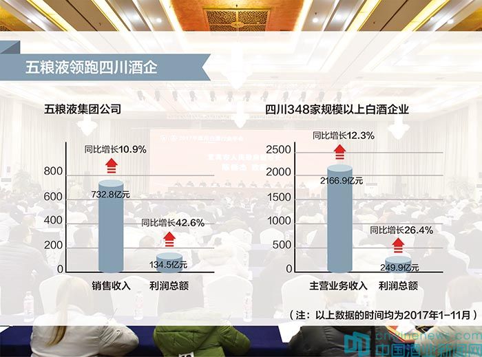 2017年1-11月,四川348家規模以上白酒企業累計生產白酒370萬千升,實現主營業務收入2166.9億元,同比增長12.3%;實現利潤總額249.9億元,同比增長26.4%。預計全省全年白酒產業實現產量430萬千升,完成主營業務收入2470億元,實現利潤290億元。