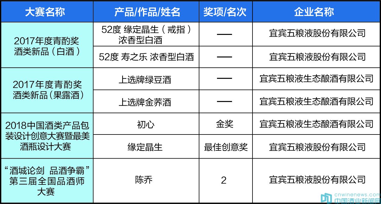 經過行業專家和自全國各地經銷商代表、消費者代表以及媒體代表共同評選,堅持公正、公平、公開的原則,保持高標準和科學性的準則,最終,宜賓五糧液股份有限公司的52度緣定晶生(戒指)濃香型白酒和52度壽之樂濃香型白酒兩款產品榮獲2017年度“青酌獎”酒類新品(白酒)獎項。五糧液生態釀酒公司于2017年推出的“上選金蕎酒”和“上選綠豆酒”兩款產品榮獲2017年度“青酌獎”酒類新品(果露酒)獎項。