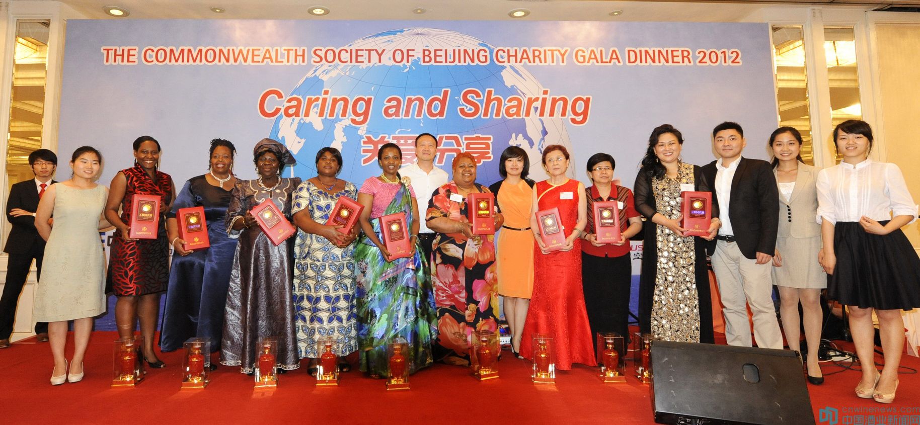 北京英聯邦慈善晚宴韓志超董事長與各國外使合影并贈送五糧國賓酒