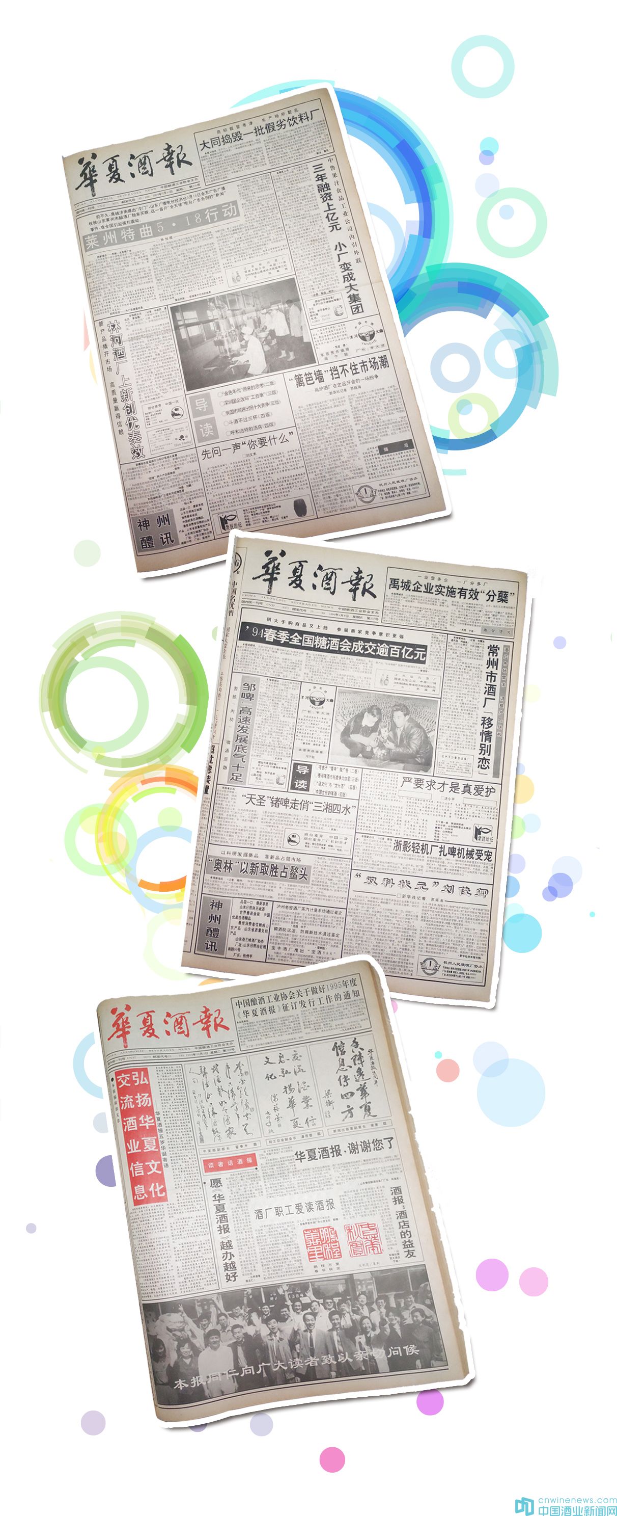 在這一年,《華夏酒報》也迎來了改版的良好機遇。經國家新聞出版署批準,自1994年1月起,《華夏酒報》由周報改為周二報,每周逢周二、五出版。1994年1月4日出版的《華夏酒報》頭版頭題本報編輯部文章《同心協力,再攀高峰——寫在華夏酒報擴大刊期之際》中提出:隨著報紙出版周期的加快,《華夏酒報》將本著五個“更加貼近”(更加貼近改革開放新形勢、更加貼近市場經濟、更加貼近社會實際、更加貼近群眾生活、更加貼近讀者)的原則,進一步拓寬報道領域,提高報紙質量。