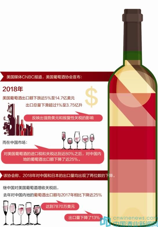 據(jù)美國媒體CNBC報道,美國葡萄酒協(xié)會(Wine Institute)宣布,2018年美國葡萄酒出口額下跌近5%至14.7億美元,出口總量下滑超過1%至3.75億升,反映出強勢美元和報復(fù)性關(guān)稅的影響。而在中國市場,對美國葡萄酒的進(jìn)口稅和關(guān)稅達(dá)到近80%之后,對中國內(nèi)地的葡萄酒出口額下降了近25%。