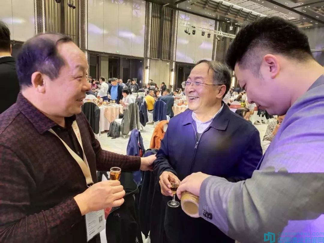 中國釀酒大師于秦峰、妙府老酒總經理于淵超與會稽山紹興股份有限公司董事長虞偉強交流合影