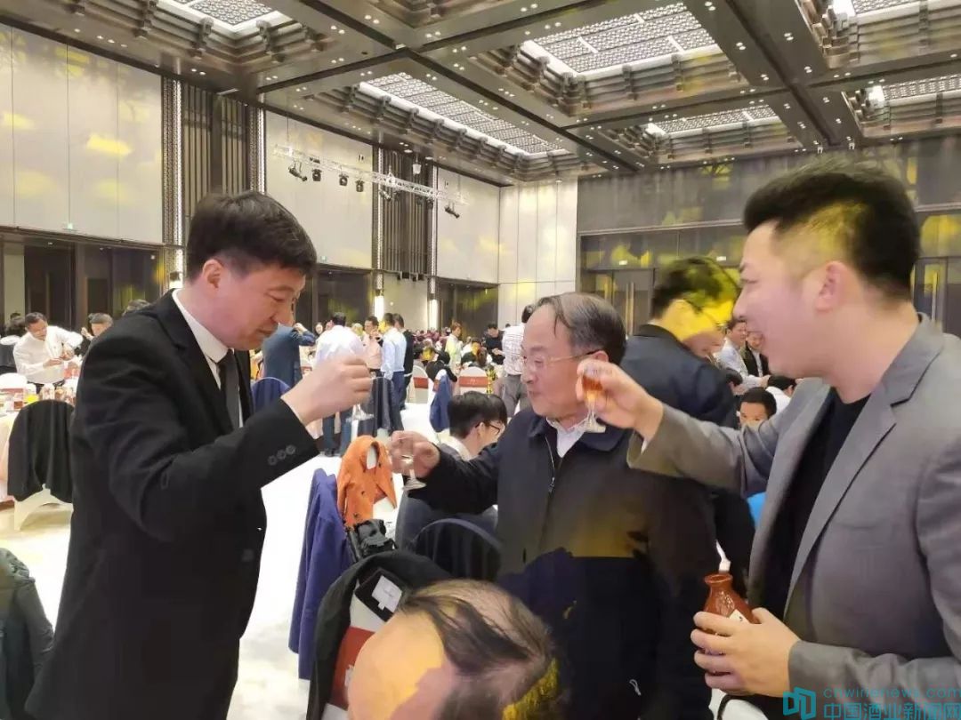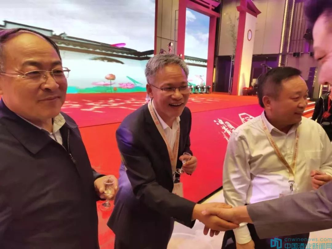 在2019年中國技能大賽---全國黃酒品酒職業技能競賽(決賽)現場中國財貿輕紡煙草工會副巡視員嚴紅先生接見中國釀酒大師于秦峰、胡志明等四位釀酒大師