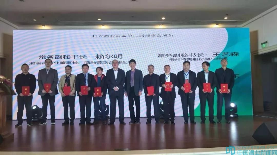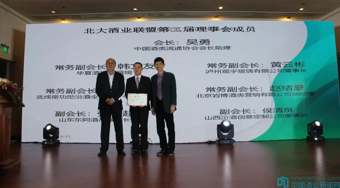 隨后,王新國、岳慶平為“北大酒業聯盟”第二屆理事會成員頒發了聘書。中國酒類流通協會會長助理、河南省酒業協會副會長吳勇為新任會長,華夏酒報總編輯韓文友、瀘州觀宇玻璃董事長黃云彬、武成帝功勛汾酒全球運營中心總裁張大成、北京巖博酒類營銷公司總經理趙緒豪為常務副會長;山東東阿酒廠董事長張令超、山西汾酒創意定制公司總經理侯清泉為副會長;瀨溪河酒業董事長賴爾明、深圳市酒類流通協會副秘書長王藝森、智度名酒評論總編輯孫延元、山西同運源酒業董事長杜僖崠為常務副秘書長。