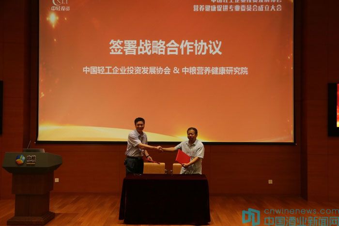 中國輕工企業投資發展協會理事長李國都先生和中糧營養健康研究院院長助理科技與市場開發部總經理鐘鳴先生共同簽署戰略合作協議,雙方單位共同推進營養健康產業工作。