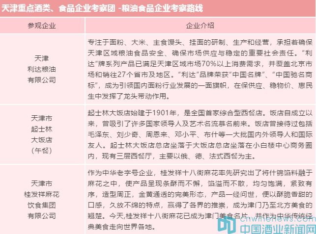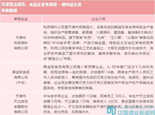 全國糖酒會是糖酒食品行業產銷對接、行業交流的重要平臺。為了提升各位遠道而來的客商的參會效果,讓更多的行業人士深入了解天津本地的名優企業及產品,全國糖酒會主辦方將于2019年10月22-23日舉辦“天津食品企業工業一日游"項目,具體日程安排請詳見下表: