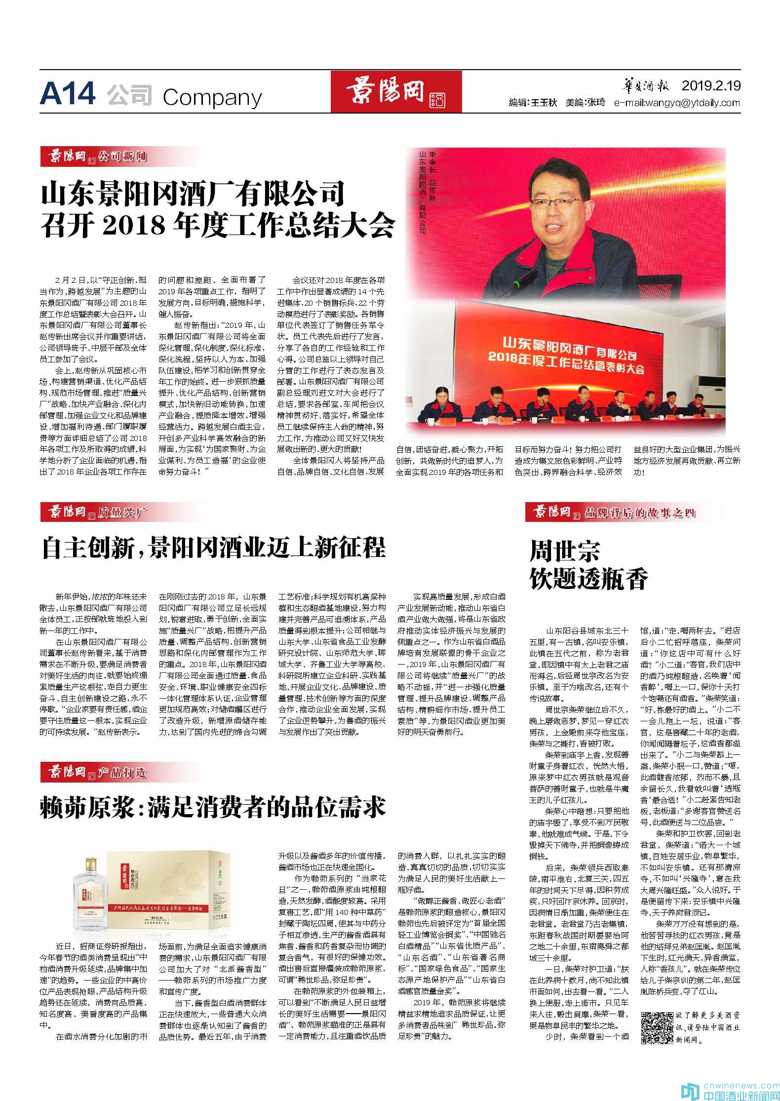 2月2日,以“守正創新,擔當作為,跨越發展”為主題的山東景陽岡酒廠有限公司2018年度工作總結暨表彰大會召開。山東景陽岡酒廠有限公司董事長趙傳新出席會議并作重要講話,公司領導班子、中層干部及全體員工參加了會議。