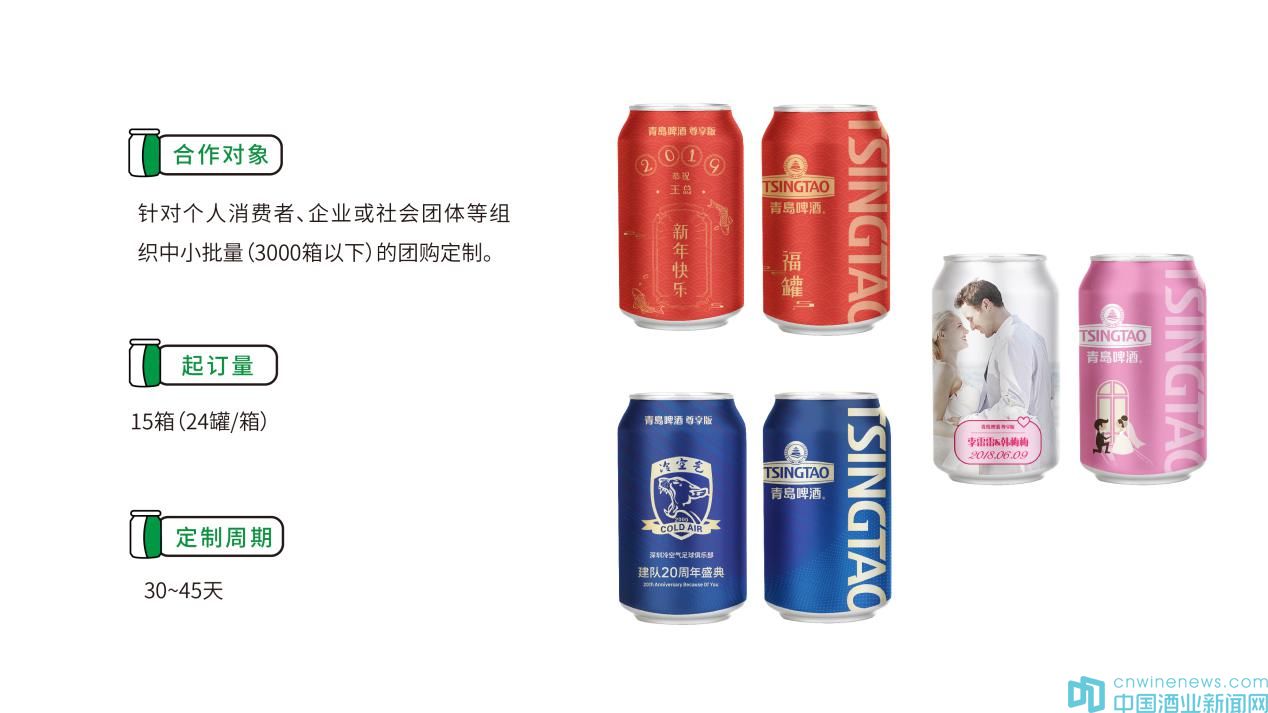 青島啤酒私人定制平臺定制對象為個人消費者、企業和社會團體等,覆蓋企業宣傳、團建聚會、婚慶節日等各種應用場景,最低可實現15箱起訂,定制周期30~45天。