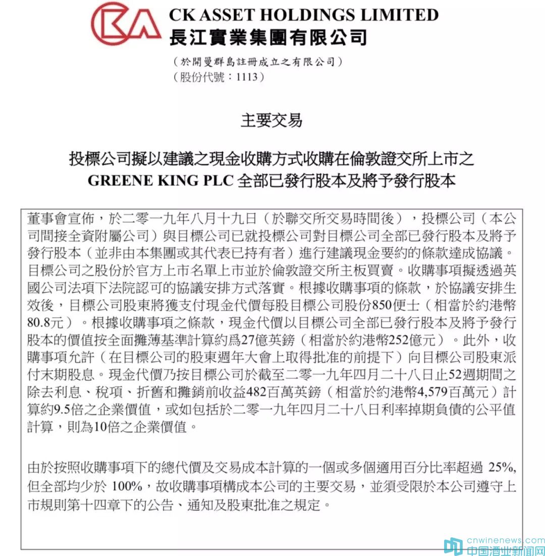 8月19日晚,由李嘉誠家族掌舵的長江實業(yè)集團(tuán)有限公司發(fā)布公告稱,公司的間接全資附屬公司CK Noble(UK) Limited以27億英鎊(相當(dāng)于約231億人民幣)收購Greene King plc(格林王)全部已發(fā)行股本及將予發(fā)行股本,并支付現(xiàn)金承擔(dān)Greene King 19億英鎊(合163億人民幣)的債務(wù)。