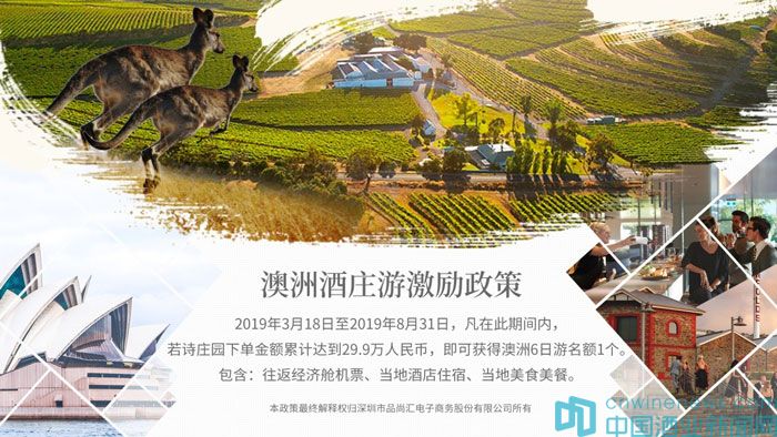 在2019年3月18日至2019年8月31日,凡在此期間,若詩莊園下單金額累計達到29.9萬金額,即可獲得澳洲酒莊六日游名額一位;紅魔鬼下單金額累計達到100萬金額,即可獲得智利酒莊游名額一位。
