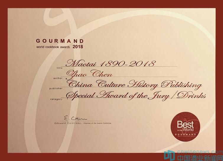 2019年7月3日,第24屆國際美食美酒圖書大賽(The Gourmand World Cookbook Awards)頒獎典禮亮相中國澳門。在本屆大賽上,知名收藏家趙晨所著的《茅臺酒收藏》榮獲唯一的特別大獎,作者趙晨受邀出席頒獎典禮并領獎。