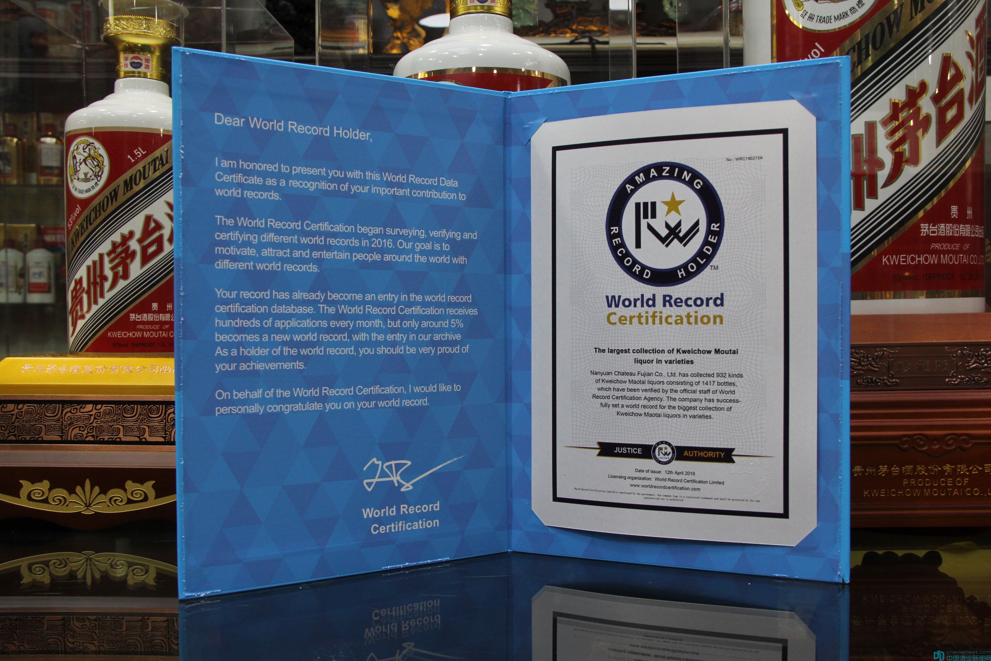 據(jù)南源酒莊總經(jīng)理王澤介紹,2019年1月19日,南源酒莊向世界紀錄認證機構(gòu)(WRCA)提出申報“收藏貴州茅臺酒品種最多”的申請,南源酒莊提交相關(guān)證明材料后,世界紀錄認證機構(gòu)英國總部于2月25日下達初審?fù)ㄖ獣?4月8日,世界紀錄認證機構(gòu)英國總部指派首席認證官與大中華區(qū)工作人員一起對南源酒莊貴州茅臺酒藏品進行實地認證,最終確認南源酒莊收藏有932種貴州茅臺酒,共計1417瓶。