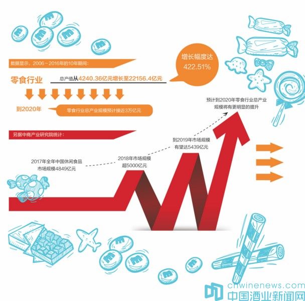 2018年12月,商務(wù)部流通產(chǎn)業(yè)促進中心發(fā)布《2018消費升級背景下零食行業(yè)發(fā)展報告》稱,零食行業(yè)發(fā)展步入快車道,呈現(xiàn)“快、廣、多、變”的特點,成為未來快速消費品市場中最具前景、最具活力的行業(yè)。中國休閑食品銷售量的不斷增長,也推動了休閑食品的市場規(guī)模快速擴大。數(shù)據(jù)顯示,2006~2016年的10年期間,零食行業(yè)總產(chǎn)值從4240.36億元增長至22156.4億元,增長幅度達422.51%,到2020年,零食行業(yè)總產(chǎn)業(yè)規(guī)模預(yù)計接近3萬億元。另據(jù)中商產(chǎn)業(yè)研究院統(tǒng)計,2017年全年中國休閑食品市場規(guī)模4849億元,2018年市場規(guī)模超5000億元,到2019年市場規(guī)模有望達到5439億元,預(yù)計到2020年零食行業(yè)總產(chǎn)業(yè)規(guī)模將有更明顯的提升。中國零食行業(yè)近年來正以驚人的速度步入產(chǎn)業(yè)快車道,進入4.0時代。