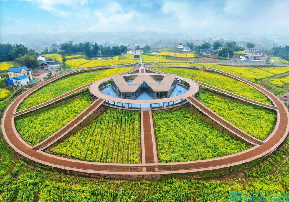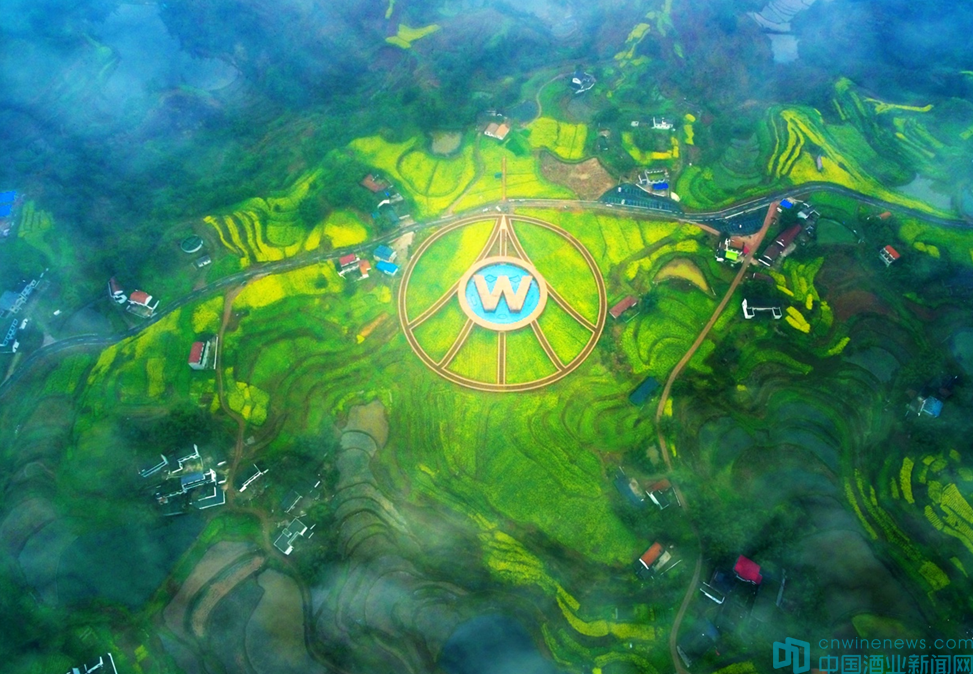 據悉,此處油菜花圍蔟而成的金色花海是五糧液糯紅高粱基地輪作的油菜。油菜花海與五糧液以企業標志為元素打造的大地藝術景觀融為一體。
