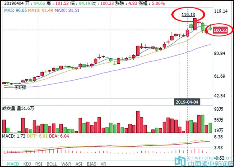 2019年,五糧液股價走上“快車道”。對比顯示,從年初的51.8元/股到今天的百元股,市值從不足2000億元到目前突破4000億元,五糧液股價和總市值累計上漲幅度實現翻番,時間僅僅用了一個季度。