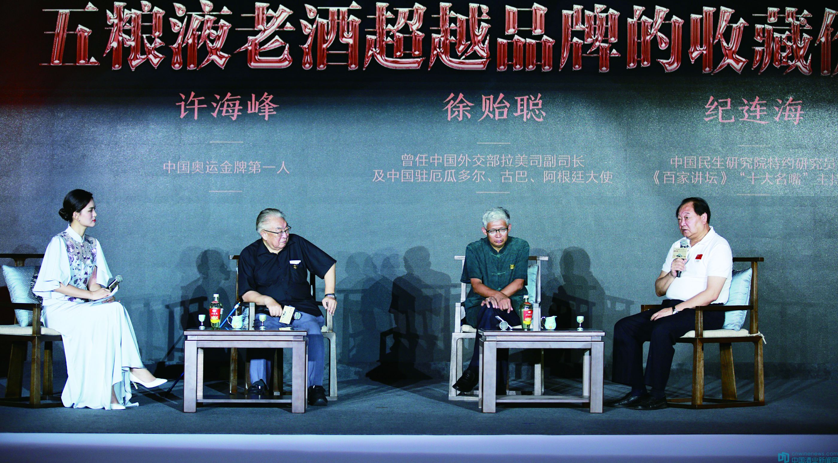 8月16日,“老酒回家”暨“五糧液傳世濃香·溯源之旅”活動在五糧液公司舉辦。圖為中國駐厄瓜多爾、古巴、阿根廷前大使徐貽聰(左二),中國奧運金牌第一人、健康中國推進委員會委員許海峰(右一),中國民生研究院特約研究員、《百家講壇》著名主講人紀連海(右二)出席活動。
