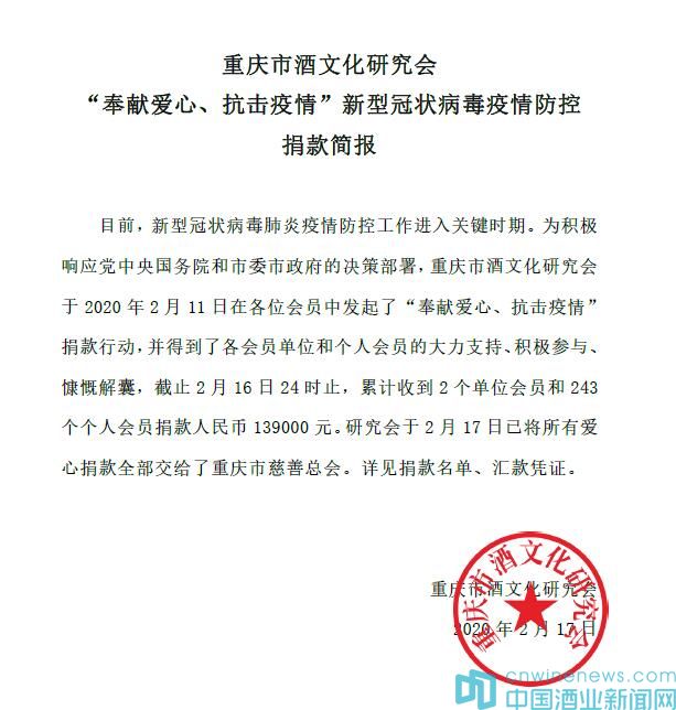 大家都說(shuō),作為普通人,“宅”在家里就是對(duì)抗擊疫情最大的貢獻(xiàn)。但是當(dāng)我看到,戰(zhàn)“疫”一線,數(shù)不勝數(shù)的感人事跡,全國(guó)酒行業(yè),一個(gè)個(gè)無(wú)私奉獻(xiàn)的壯舉,我就想我們還需要做點(diǎn)什么?重慶市酒文化研究會(huì)會(huì)長(zhǎng)陳昌斌將研究會(huì)會(huì)員第一次集體捐獻(xiàn)的139000元全部匯款到重慶市慈善總會(huì)后表示。