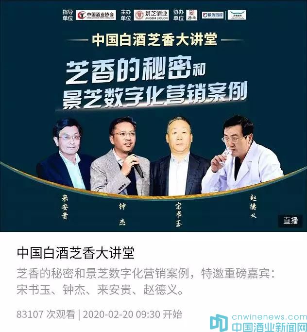 2月20日上午,中國酒業(yè)協(xié)會(huì)指導(dǎo),景芝酒業(yè)主辦,源坤教育、極優(yōu)智能、海納機(jī)構(gòu)協(xié)辦——中國酒業(yè)第一場(chǎng)企業(yè)主辦線上直播課堂——《中國白酒芝香大講堂》如期開播,兩個(gè)多小時(shí)的直播吸引酒類從業(yè)者、消費(fèi)者8萬余人在線觀看。