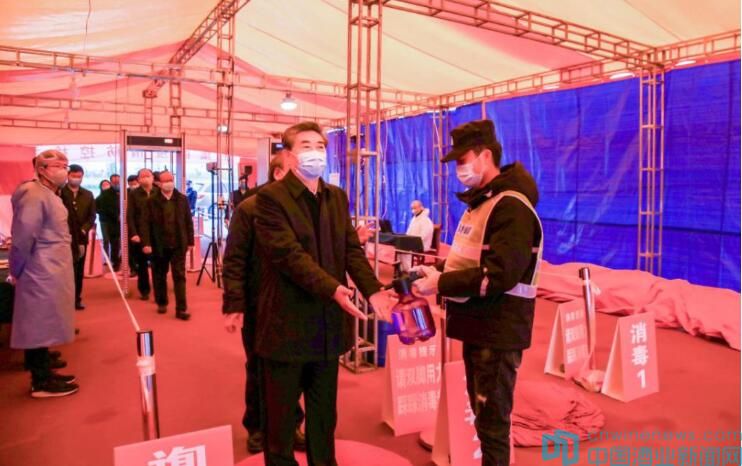 ▲省委常委、常務副省長鄧向陽(右二)通過熱成像體溫儀后接受噴灑酒精消毒