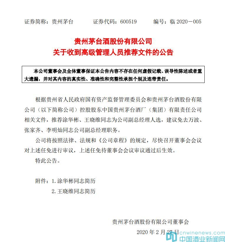 該公告稱,控股股東中國貴州茅臺酒廠(集團)有限責任公司推薦涂華彬、王曉維同志為公司副總經理人選,建議免去萬波、張家齊、李明燦同志公司副總經理職務。公司將按照法律、法規和《公司章程》的規定,盡快召開董事會會議對上述任免進行審議,上述任免待董事會會議審。
