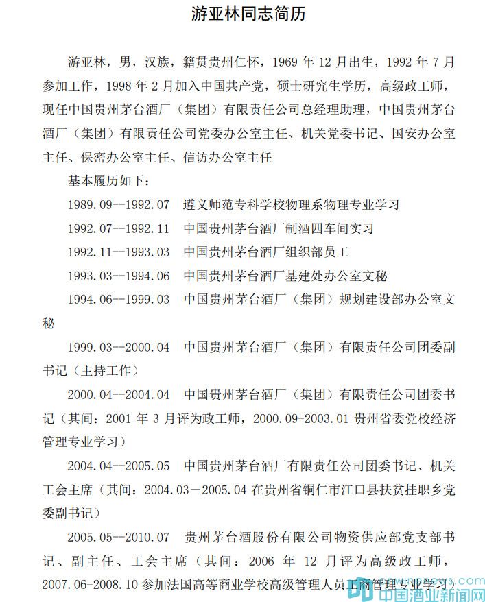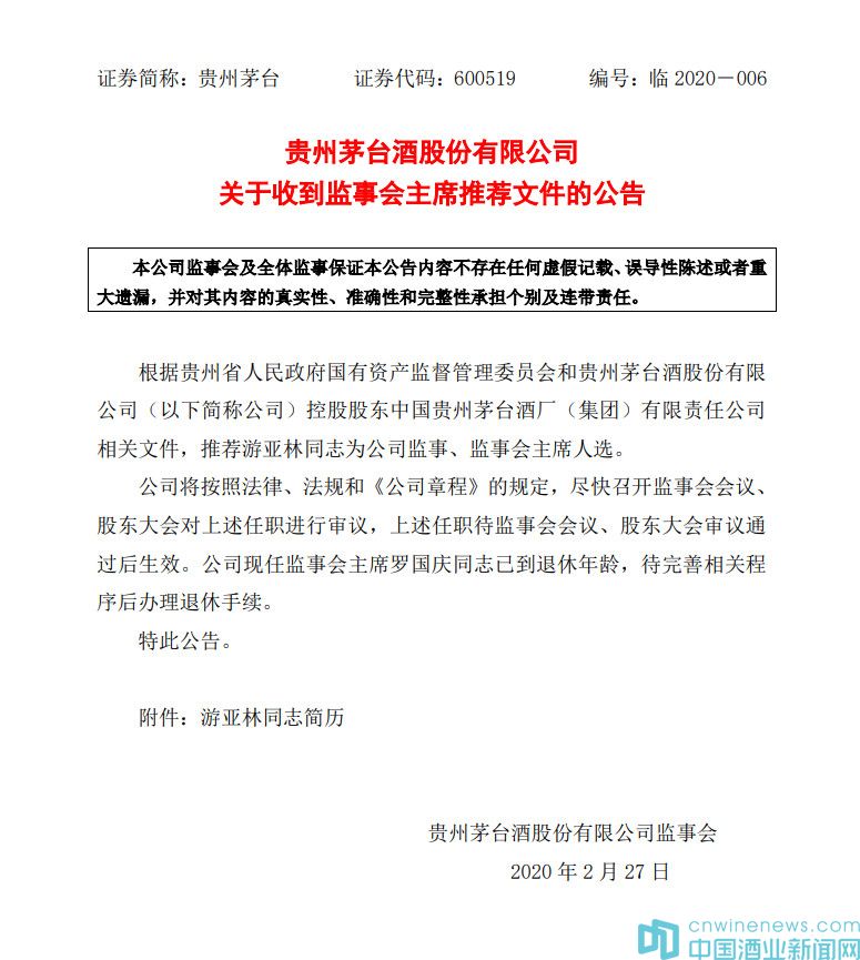 同日,貴州茅臺還發布“貴州茅臺酒股份有限公司關于收到監事會主席推薦文件的公告”,控股股東中國貴州茅臺酒廠(集團)有限責任公司推薦游亞林同志為公司監事、監事會主席人選。