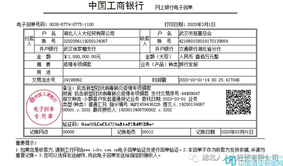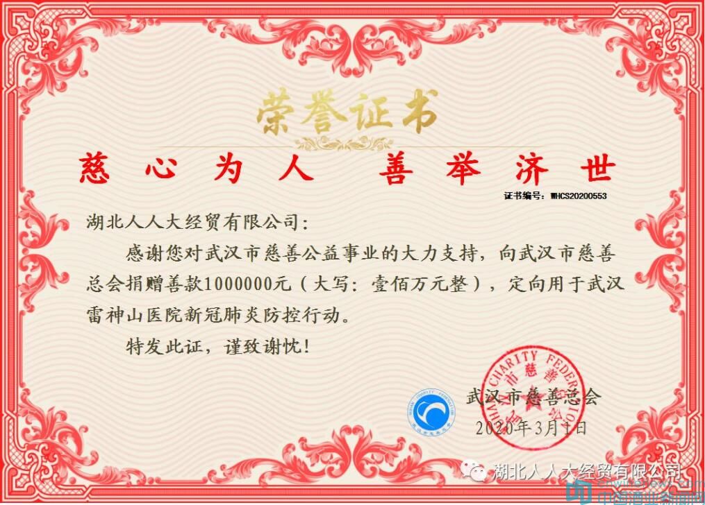 湖北人人大經貿有限公司高度關注疫情進展,在積極響應政府對疫情防控工作的部署、努力做好企業復工復產準備工作的同時,切實履行公司社會責任,全力支持抗擊新冠肺炎疫情工作。2020年3月1日,繼前次向湖北省慈善總會捐款250,000元人民幣后,公司再次向武漢市慈善總會捐贈1,000,000元人民幣,捐款將直接納入武漢市慈善總會新型冠狀病毒防控專項基金,款項全部用于支援抗擊新冠肺炎疫情工作。
