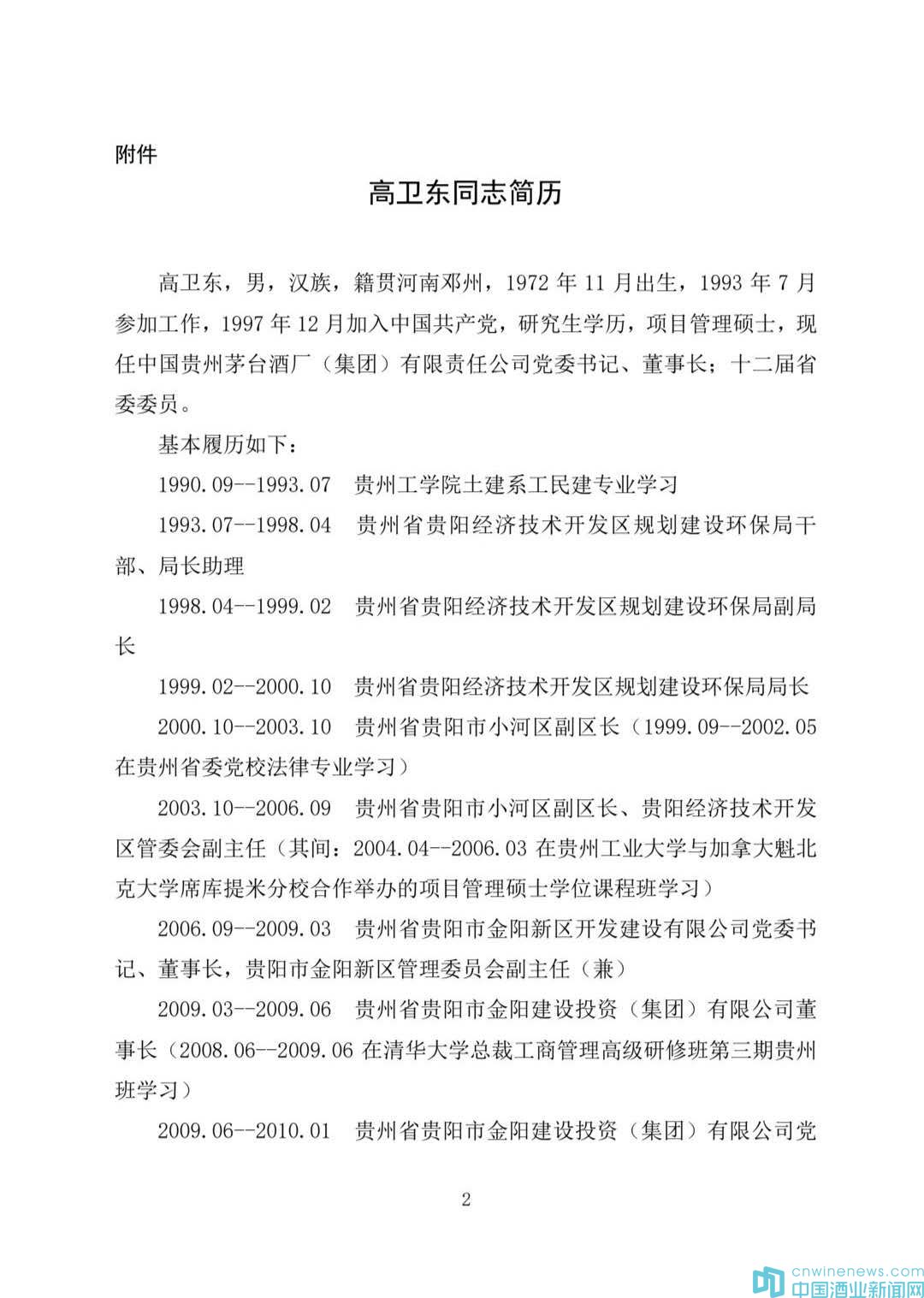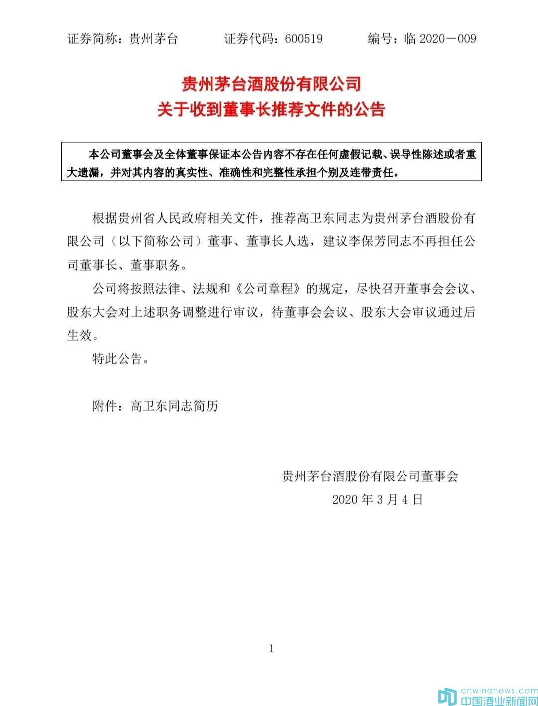 根據(jù)貴州省人民政府相關(guān)文件,推薦高衛(wèi)東同志為貴州茅臺酒股份有限公司(以下簡稱公司)董事、董事長人選,建議李保芳同志不再擔(dān)任公司董事長、董事職務(wù)。