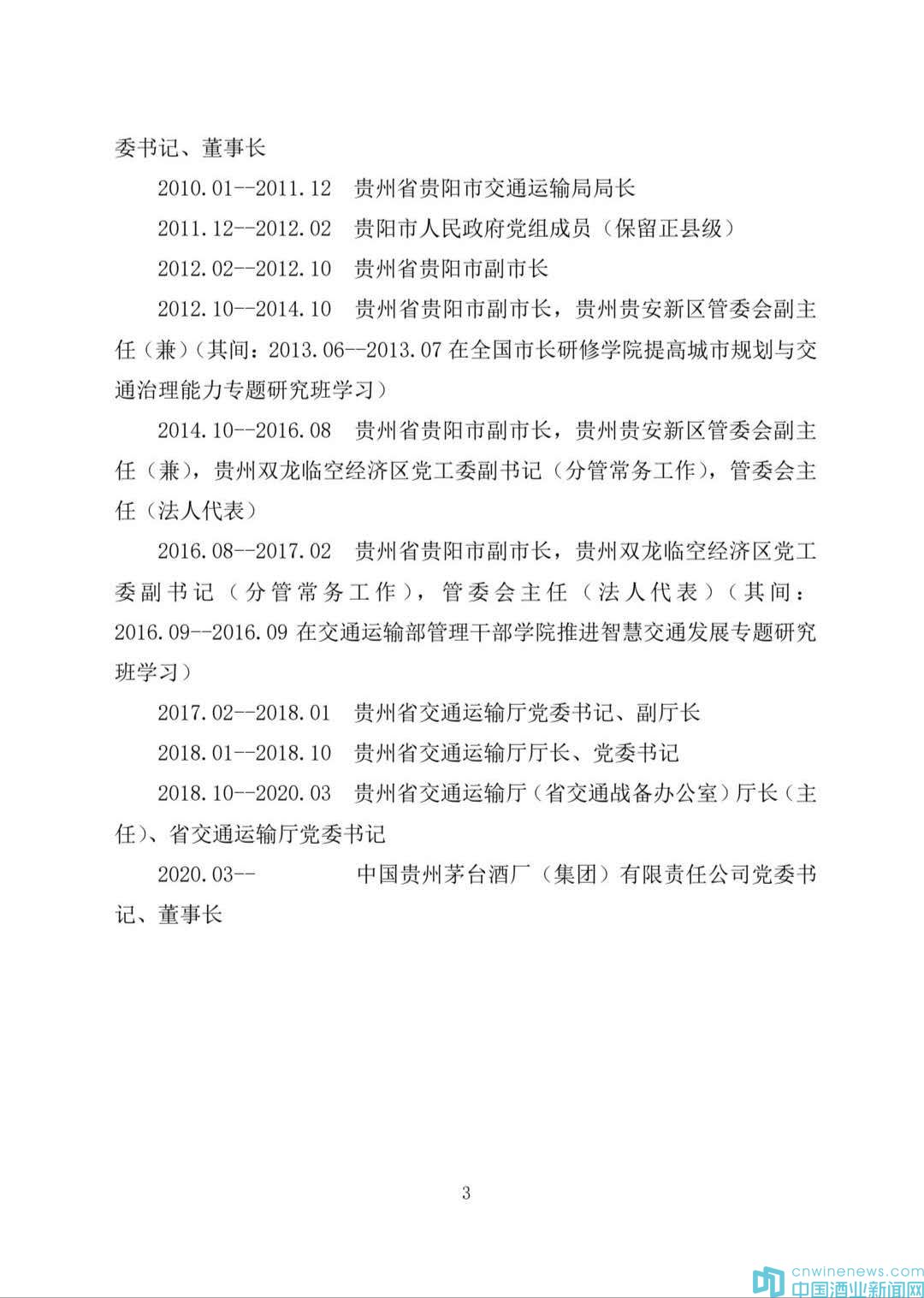 2020.03-- 中國貴州茅臺酒廠(集團(tuán))有限責(zé)任公司黨委書記、董事長
