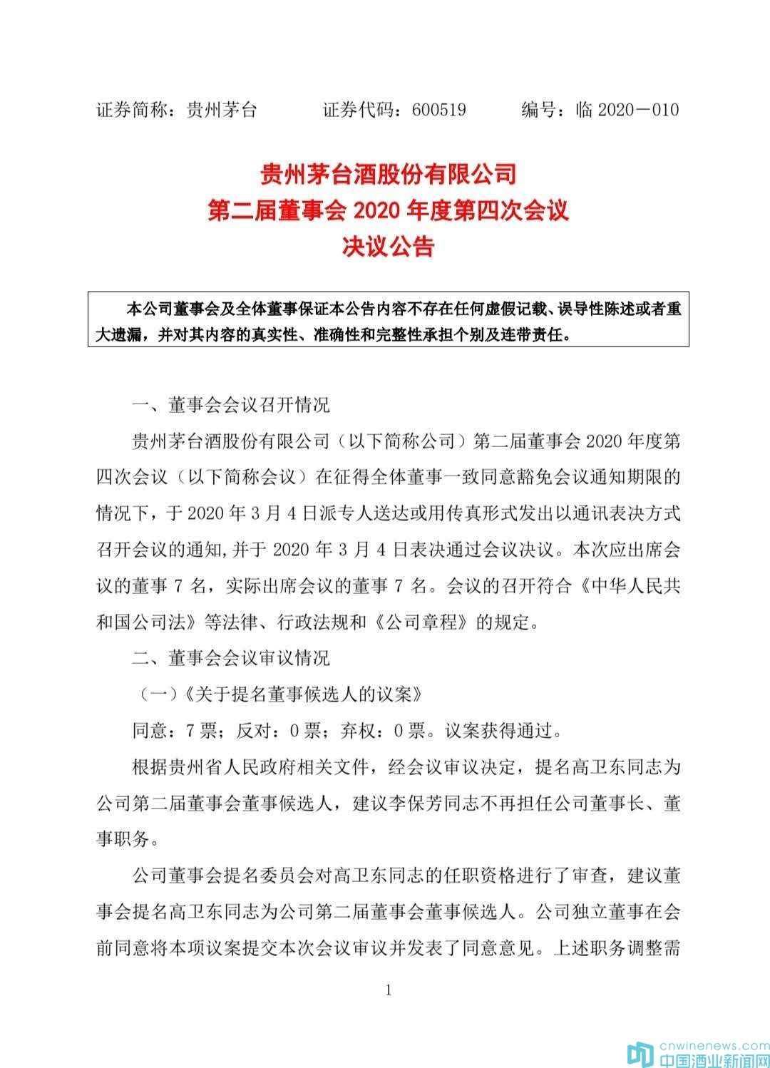 3月3日,貴州茅臺發布公告稱,收到貴州省人民政府相關文件,推薦高衛東為貴州茅臺酒股份有限公司董事、董事長人選,建議李保芳不再擔任公司董事長、董事職務。