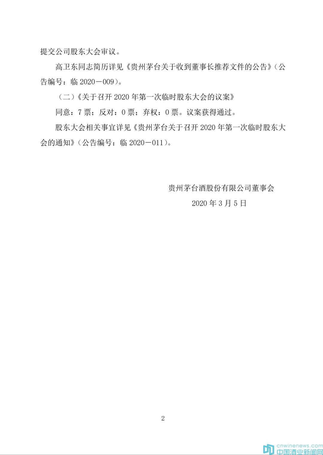 同時,貴州茅臺另一則公告顯示,將于3月20日召開2020 年第一次臨時股東大會,審議《關于選舉董事的議案》和《關于選舉監事的議案》。