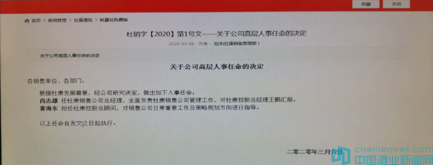 文中說(shuō),根據(jù)杜康發(fā)展需要,經(jīng)公司研究決定,做出如下人事任命。肖志雄任杜康銷(xiāo)售公司總經(jīng)理,全面負(fù)責(zé)杜康銷(xiāo)售公司管理工作,對(duì)杜康控股總經(jīng)理王鵬匯報(bào);黃海東擔(dān)任杜康控股總顧問(wèn),對(duì)銷(xiāo)售公司日常重要工作及策略規(guī)劃方向進(jìn)行指導(dǎo)。