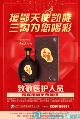 疫情發(fā)生到現(xiàn)在,遼寧三溝酒業(yè)對(duì)抗疫一線醫(yī)護(hù)人員的關(guān)愛(ài)從未間斷。這不,三溝酒業(yè)又為遼寧援鄂凱旋的天使送上了最真誠(chéng)的祝福與喝彩:即日起,凡遼寧援鄂醫(yī)護(hù)人員于2020年12月31日前舉辦結(jié)婚喜宴,憑有效證件和單位證明登記報(bào)名,均可在喜宴上免費(fèi)享用三溝多糧香美酒!