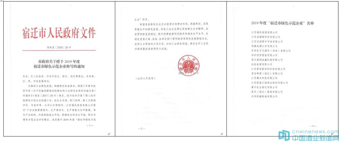在3月17日下午召開的宿遷市全市加快工業經濟高質量發展暨招商引資大會上,乾隆江南酒業等15戶企業,能源高效化、生產清潔化、生產智能化水平提高,單位產品能耗、污染物排放水平低,資源綜合利用水平高,符合市綠色示范企業評價要求,榮獲2019年度“宿遷市綠色示范企業”稱號。據介紹,宿遷市第三批市級綠色示范企業創建工作,經企業申報、部門初審、第三方機構評價、專家評審、公開公示等程序,共有15戶企業入選。