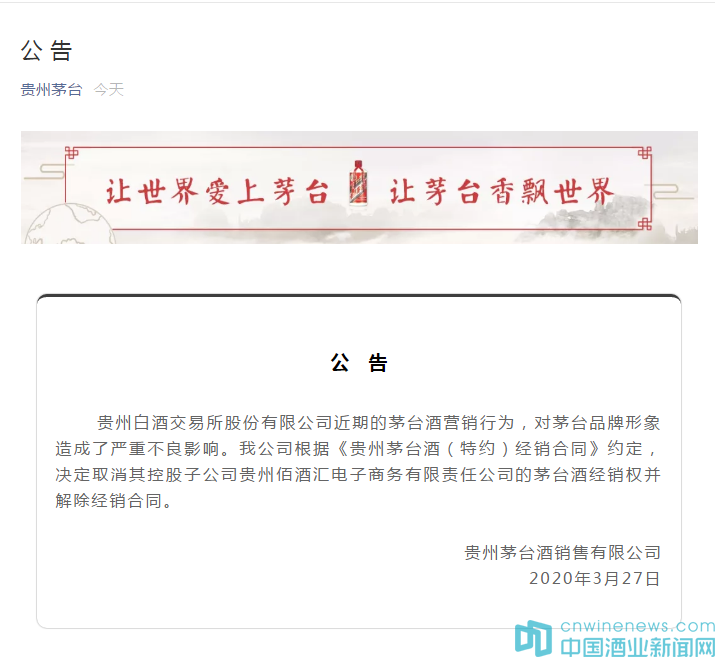 3月27日,貴州茅臺酒銷售有限公司發布公告,公告稱貴州白酒交易所近期的茅臺酒營銷行為,對茅臺品牌形象造成了嚴重不良影響。公司根據《貴州茅臺酒(特約)經銷合同》約定,決定取消其控股子公司貴州佰酒匯電子商務有限責任公司的茅臺酒經銷權并解除經銷合同。