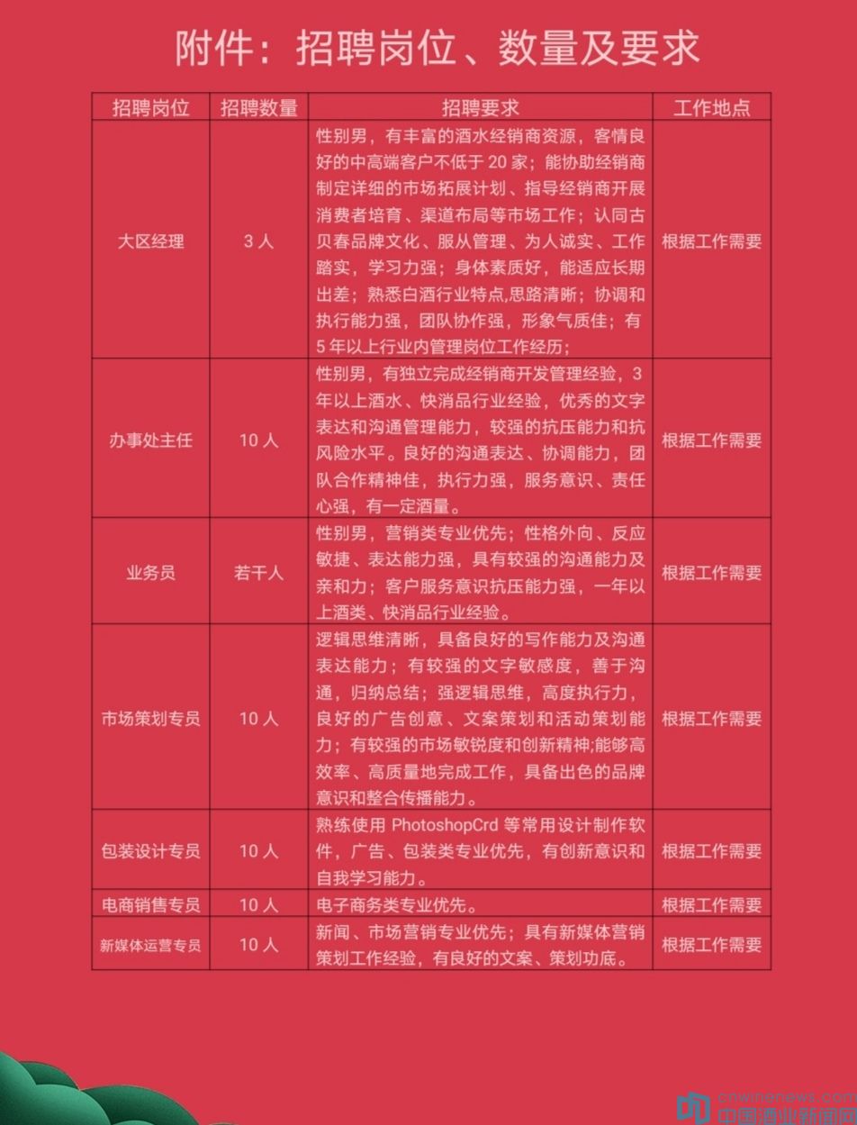 招聘年齡要求:市場大區經理、辦事處主任崗位年齡在25-35歲之間;其他策劃、新媒體、電商、業務員崗位年齡要求在:21-30歲之間。所有招聘人員學歷要求:全日制專科以上學歷。有白酒從業經驗,設計、策劃、電商運營經驗者優先。