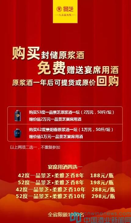 1.符合條件的消費(fèi)者,活動期間以1萬元的特惠價(jià)格封儲一壇“一品景芝·百年好合/狀元酒”(50斤62度景陽春原酒),即可獲得免費(fèi)贈送1萬元的一品景芝宴席用酒。