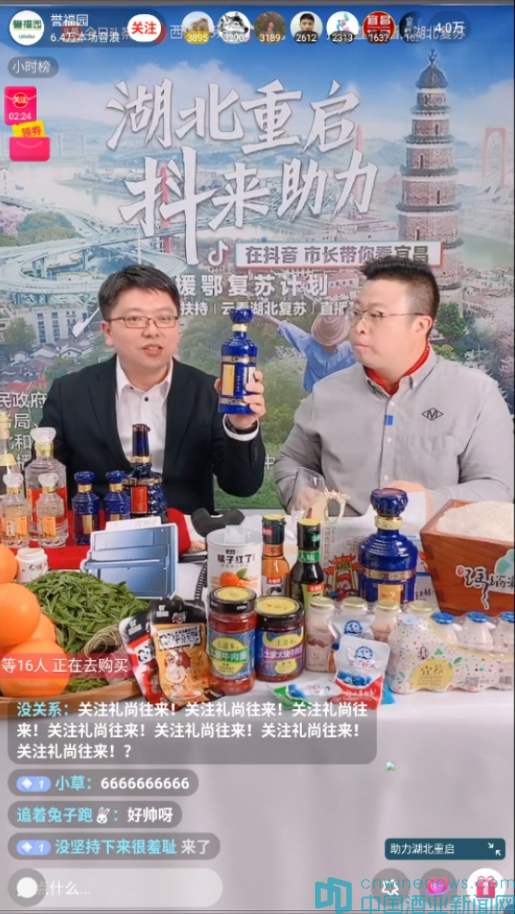 4月14日下午,“湖北重啟抖來助力·抖音援鄂復蘇計劃——市長帶你看宜昌”直播活動啟動,宜昌市副市長周正英秒變“超級推銷員”走進抖音直播間,為宜昌特色農產品直播代言,稻花香等本地精品農產品及特色品牌輪番上陣,向全國網友展現其“十八般武藝”,大家共同為“鄂”帶貨,為“鄂”拼單,助力湖北復蘇。